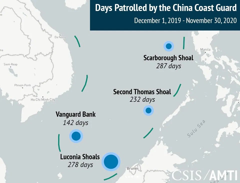 Vẫn theo AMTI, đại dịch Covid-19 đã không ngăn cản hoặc kìm hãm bớt Trung Quốc triển khai các tàu hải cảnh “xung quanh các địa điểm mang tính biểu tượng quan trọng” ở Biển Tây Philippines, trong đó có các bãi cạn Scarborough và bãi Cỏ Mây (Second Thomas Shoal). Các đội tàu hải cảnh của Trung Quốc không chỉ duy trì “sự hiện diện lâu dài” tại những bãi cạn Scarborough, bãi Cỏ Mây và bãi Luconia, mà còn dường như đã “gia tăng tần số tuần tra” tại những khu vực này trong suốt giai đoạn dịch bệnh.