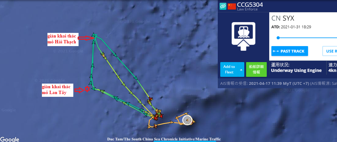 Hải cảnh 5304 tiếp tục thực hiện thêm 2 lần tiếp cận các khu vực khai thác dầu khí của Việt Nam tại Lô 05.2 và Lô 06.1 vào ngày 12 và 15/4/2021 với khoảng cách gần nhất đến giàn khai thác tại mỏ Hải Thạch (Lô 05.2) khoảng hơn 1 hải lý và giàn khai thác tại mỏ Lan Tây (Lô 06.1) khoảng hơn 2 hải lý.