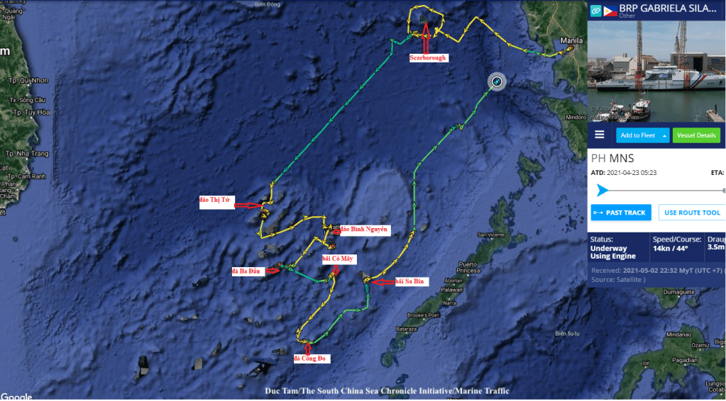 Tàu tuần tra xa bờ BRP Gabriela Silang (OPV-8301), tàu tuần tra lớn nhất và hiện đại nhất của Lực Lượng bảo vệ bờ biển Philippines đã thực hiện một cuộc tuần tra tại khu vực bãi cạn Scarborough và quần đảo Trường Sa bắt đầu từ ngày 23/4/2021. BRP Gabriela Silang đã tuần tra xung quanh bãi cạn Scarborough từ ngày 24 đến 25/4; khu vực đảo Thị Tứ từ ngày 26 đến 28/4; khu vực đảo Bình Nguyên, đảo Vĩnh Viễn và bãi Hải Sâm (quần đảo Trường Sa) ngày 29/4; đá Ba Đầu ngày 30/4; bãi Cỏ Mây ngày 30/4; đá Công Đo ngày 1/5; bãi Sa Bin ngày 1/5. Ảnh: Lê Đức Tâm/Dự án Đại Sự Ký Biển Đông/Marine Traffic.
