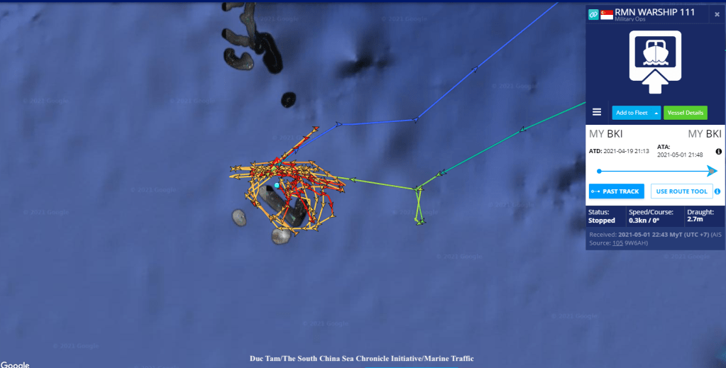 Từ ngày 20/4 đến 1/5/2021, tàu tuần tra cỡ lớn KD Keris của hải quân Malaysia đã hoạt động tại khu vực bãi cạn Nam Luconia (cách bờ biển Malaysia khoảng gần 80 hải lý) nơi có sự hiện diện của tàu Hải cảnh 5204 của Trung Quốc. Ảnh: Lê Đức Tâm/Dự án Đại Sự Ký Biển Đông/Marine Traffic