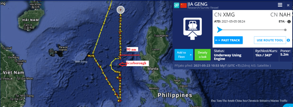 Tàu nghiên cứu khoa học biển Gia Canh (Jia Geng) của Trung Quốc tiếp tục hoạt động trong vùng đặc quyền kinh tế của Philippines từ phía đông bắc quần đảo Trường Sa đến cửa eo Bashi với khoảng cách đến bờ biển nước này từ 100 đến 160 hải lý. Trước đó, ngày 5/5/2021, tàu nghiên cứu biển của Trung Quốc rời cảng Hạ Môn và hoạt động tại khu vực phía đông bãi Macclesfield từ 30 đến 60 hải lý từ ngày 7 đến 10/5. Từ ngày 12/5, Gia Canh bắt đầu đi vào vùng đặc quyền kinh tế của Philippines sau đó đã tác nghiệp tại khu vực phía đông bắc Bãi Cỏ Rong và vùng biển phía tây Philippines cách bờ biển nước này từ 90 đến 120 hải lý.