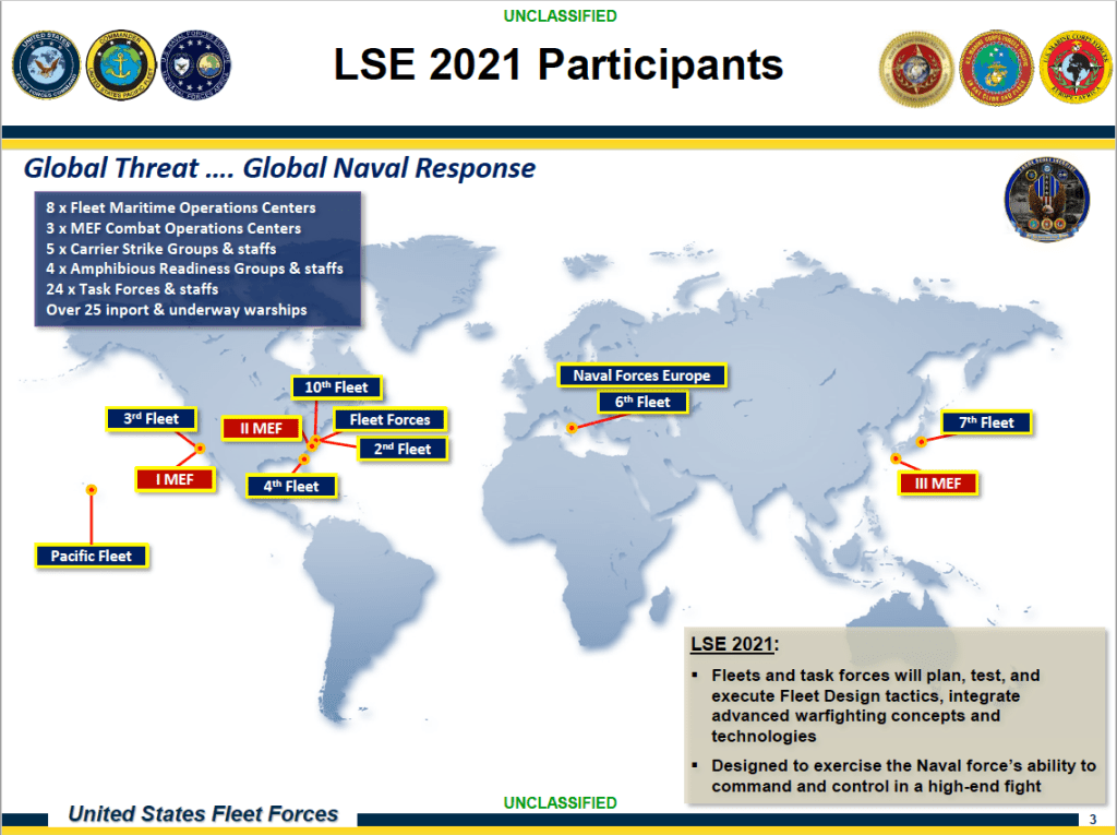 Và trong khi lực lượng Thái Bình Dương của Hải quân Hoa Kỳ đang diễn tập LSGE’21, Cuộc tập trận Quy mô lớn của Hải quân Hoa Kỳ (LSE21) sẽ diễn ra đến hết ngày 16/8/2021 với các lực lượng hải quân hoạt động trên toàn cầu bao gồm hơn 80 đơn vị trải dài 17 múi giờ và sáu đơn vị Hải quân và Thủy quân lục chiến. Các đơn vị sẽ tham gia huấn luyện đội tàu tích hợp toàn cầu theo kịch bản trực tiếp và mô phỏng. Đây được cho là cuộc tập trận quy mô chưa từng có kể từ Chiến tranh Lạnh.