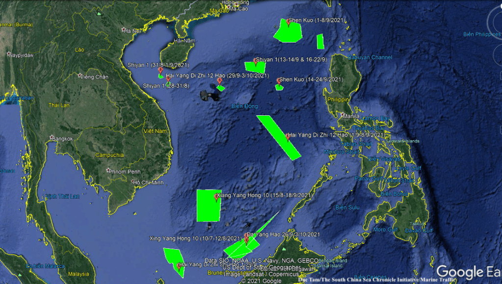 Trong tháng 9/2021, các tàu khảo sát, nghiên cứu khoa học của Trung Quốc đã hoạt động trên khắp các khu vực của Biển Đông trong đó có 6 lượt tàu hoạt động tại các vùng đặc quyền kinh tế của các nước xung quanh Biển Đông. Cụ thể: