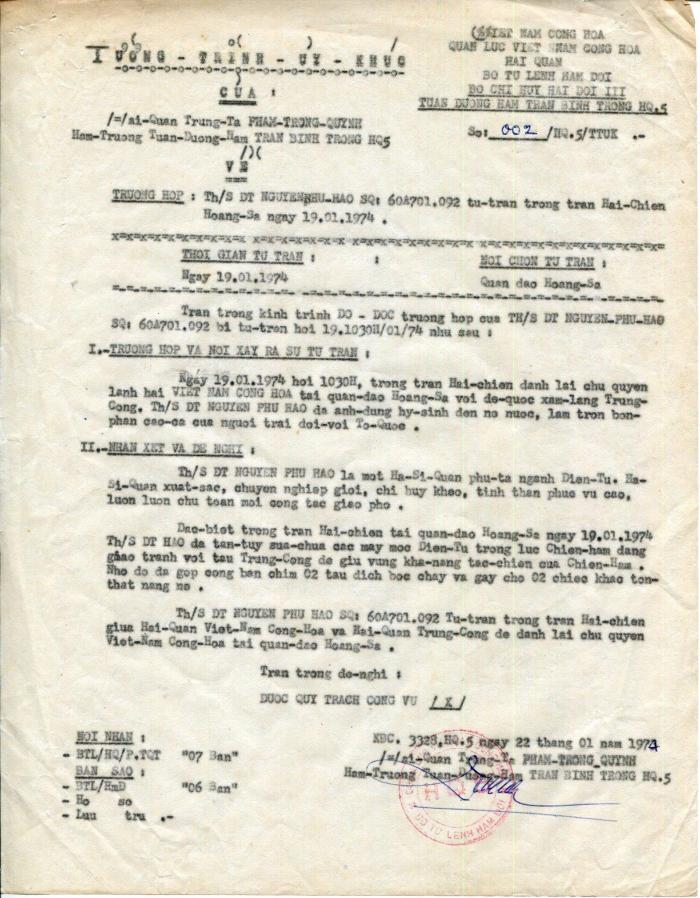 “… Đặc biệt trong trận hải chiến tại quần đảo Hoàng Sa ngày 19-01-1974, Th/S ĐT Hảo đã tận tụy sửa chữa các máy móc điện tử trong lúc chiến hạm đang giao tranh với tàu Trung Cộng để giữ vững khả năng tác chiến của chiến hạm, nhờ đó đã góp công bắn chìm 2 tàu địch và gây cho 2 chiệc khác tổn thất nặng nề. Th/S DT NGUYEN PHU HAO SQ:60A701.092 từ trần trong trận hải chiến giữa Hải Quân Việt Nam Cộng Hòa và Hải Quân Trung Cộng để giành lại chủ quyền Việt Nam Cộng Hòa tại quần đảo Hoàng Sa… “. Nguồn: Lâm Nguyễn.