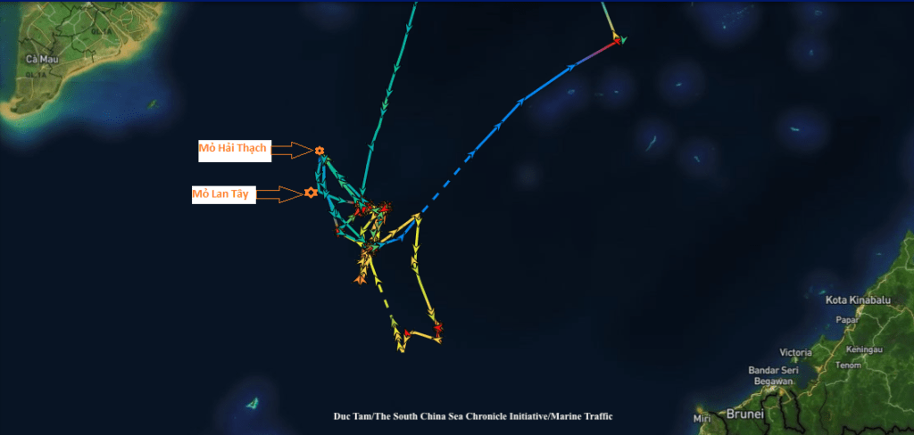 Tại vùng biển phía tây nam Biển Đông, Trung Quốc đã sử dụng 2 tàu hải cảnh số hiệu 5202 và 5302 tuần tra khẳng định “yêu sách chủ quyền” đồng thời tiếp cận các khu vực khai thác dầu khí của Việt Nam tại các lô 05.2, 05.3 và 06.1 kể từ đầu năm 2022. Trong đó, Hải cảnh 5302 đã hoạt động tại khu vực này từ cuối tháng 12/2021 đến cuối tháng 01/2022 với 4 lần tiếp cận gần giàn khai thác mỏ Lan Tây (Lô 06.1) và mỏ Hải Thạch (Lô 05.2) vào các ngày 26/12/2021, 4/1, 11/1 và 21/1/2022. Sau đó, Hải cảnh 5202 thay thế tiếp tục thực hiện thêm 3 lần tiếp cận các khu vực khai thác dầu khí của Việt Nam vào các ngày 25/1, 2/2 và 11/2/2022. Sau khi Hải cảnh 5202 rời đi (ngày 17/2/2022), chúng tôi chưa phát hiện tàu Hải cảnh nào khác của Trung Quốc tại khu vực này qua dữ liệu AIS.