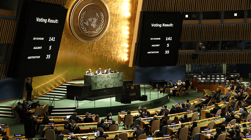 Thẩm quyền đạo đức và pháp lý của nghị quyết được thể hiện ở số lượng rất lớn phiếu bầu ủng hộ. Số phiếu này vượt quá 2/3 đa số cần thiết cho “các câu hỏi quan trọng”, bao gồm các câu hỏi liên quan đến “duy trì hòa bình và an ninh quốc tế”. Theo nghị quyết Đoàn kết vì Hòa bình, những điều này có thể bao gồm khuyến nghị các thành viên hành động đơn phương hoặc tập thể để khôi phục hòa bình trong trường hợp có hành động xâm lược. 2/3 được tính dựa trên số thành viên “có mặt và bỏ phiếu”, trong trường hợp Ukraine là 141 ủng hộ và 5 phản đối. Có 35 phiếu trắng, tức là các thành viên có mặt nhưng không bỏ phiếu. Việc 95 quốc gia tài trợ cho nghị quyết là một thước đo khác về sức nặng đạo đức và chính trị của nghị quyết.