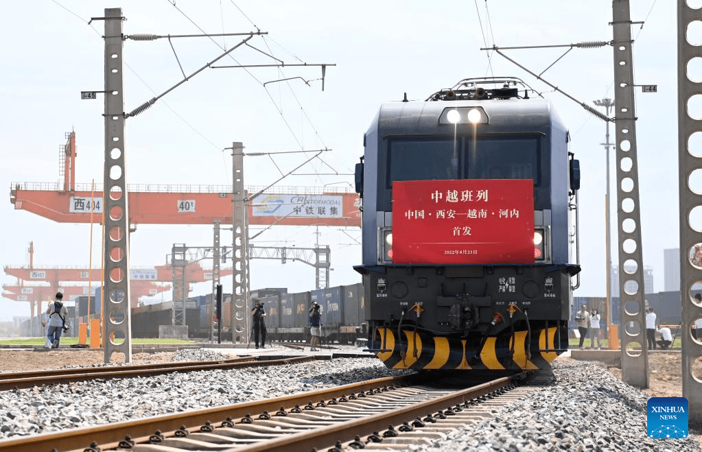 Một chuyến tàu hàng từ cảng quốc tế Tây An đã rời đi Hà Nội hôm thứ Ba ngày 24/8/2022, thiết lập tuyến tàu hàng hóa Trung Quốc-Việt Nam đầu tiên nối Thiểm Tây và Việt Nam, theo Tân Hoa Xã.