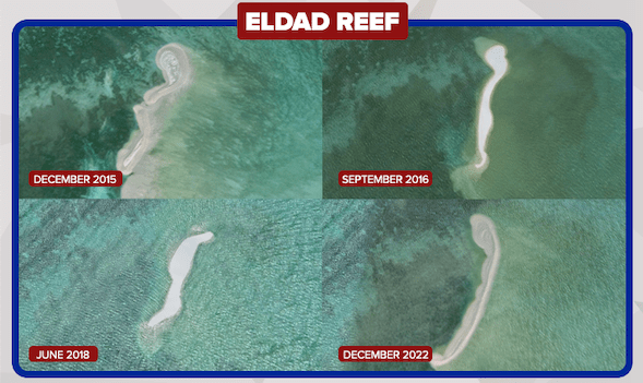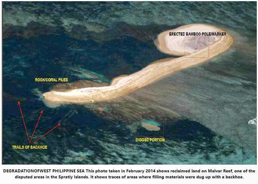 Báo cáo phân tích Én Đất qua ảnh vệ tinh của Trung tâm Luật quốc tế tại Đại học Quốc gia Singapore cũng cho biết dấu vết nạo vét có thể nhìn thấy trên một số phần cát của rạn san hô, tổng diện tích bề mặt là 1,35m2. Mặc dù vào thời điểm những năm đó, chưa có ảnh vệ tinh chụp được các tàu nạo vét, tình báo và phương tiện truyền thông Philippines khẳng định Én Đất đã là mục tiêu hoạt động xây dựng của Trung Quốc khi đó. Tháng 6/2014, Phát ngôn viên Bộ Quốc phòng Philippine Peter Paul Galvez cung cấp hình ảnh chụp từ vệ tinh cho thấy tàu dân quân biển Trung Quốc được hình dung đang bốc dỡ một máy đào thủy lực đổ bộ tại Én Đất. Theo các quan chức phương Tây được trích dẫn trong báo cáo của Bloomberg ngày 21/12/2022, các hình ảnh ở Én Đất cho thấy những hố lớn, đống mảnh vỡ và dấu vết của máy xúc tại một địa điểm trước đây chỉ lộ ra một phần khi thuỷ triều lên.