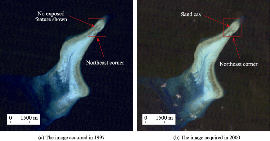 Theo bài báo của các nhà nghiên cứu Trung Quốc công bố vào năm 2018 dựa trên nguồn ảnh vệ tinh mà họ có được, các vật liệu đá vôi bắt đầu tích tụ ở góc đông bắc của Én Đất từ năm 1998, và cồn cát có thể được nhìn thấy rõ ràng khi các tích tụ cao lên nổi trên mặt nước vào năm 2000. Địa hình của một cồn cát như vậy dễ thay đổi dưới tác động của gió mùa và triều cường, nhưng càng ngày diện tích cồn cát nổi ở triều cao càng tăng dần. Báo cáo của các nhà nghiên cứu Trung Quốc không cho biết rõ ngày cụ thể của tấm ảnh vệ tinh.