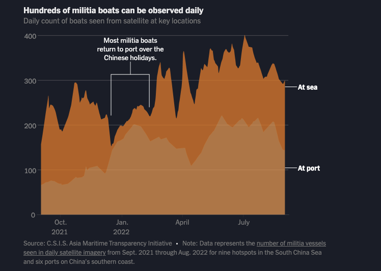 Bắc Kinh một mực nói nhiều tàu trong số những con tàu bao phủ khắp Biển Đông chỉ đang đánh cá. Trên giấy tờ, họ chỉ là những thường dân làm nghề đánh cá thương mại. Nhưng những con tàu này lại có súng máy, lựu đạn phóng tên lửa và pháo nước tốc độ cao. Hạm đội này, được xây dựng phần lớn bằng tiền của chính phủ, hoạt động song song với lực lượng hải cảnh hung hãn, giúp Trung Quốc thống trị một trong những tuyến đường thủy quan trọng và gây tranh chấp nhất trên thế giới: Biển Đông. Việc làm mờ ranh giới là có chủ ý: Lãnh đạo Trung Quốc, Tập Cận Bình, đã nhấn mạnh sự cần thiết của sự đoàn kết dân sự-quân sự để thúc đẩy an ninh quốc gia.