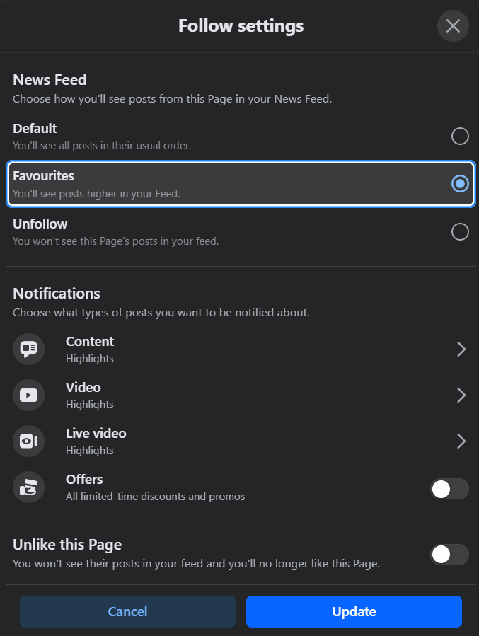 Do thuật toán của Facebook, các bài viết của Dự án có thể không hiện trên trang nhà (New Feed) của độc giả. Để tăng khả năng hiển thị bài viết của Dự án trên trang nhà mình, quý độc giả tiếp tục bấm vào nút “Liked” (Thích) để thay đổi tùy chọn theo dõi sang “Favorites” (Ưa thích) và chọn “Update” (Cập nhật). Quý độc giả có thể sử dụng hình ảnh chụp màn hình sau để làm theo hướng dẫn: