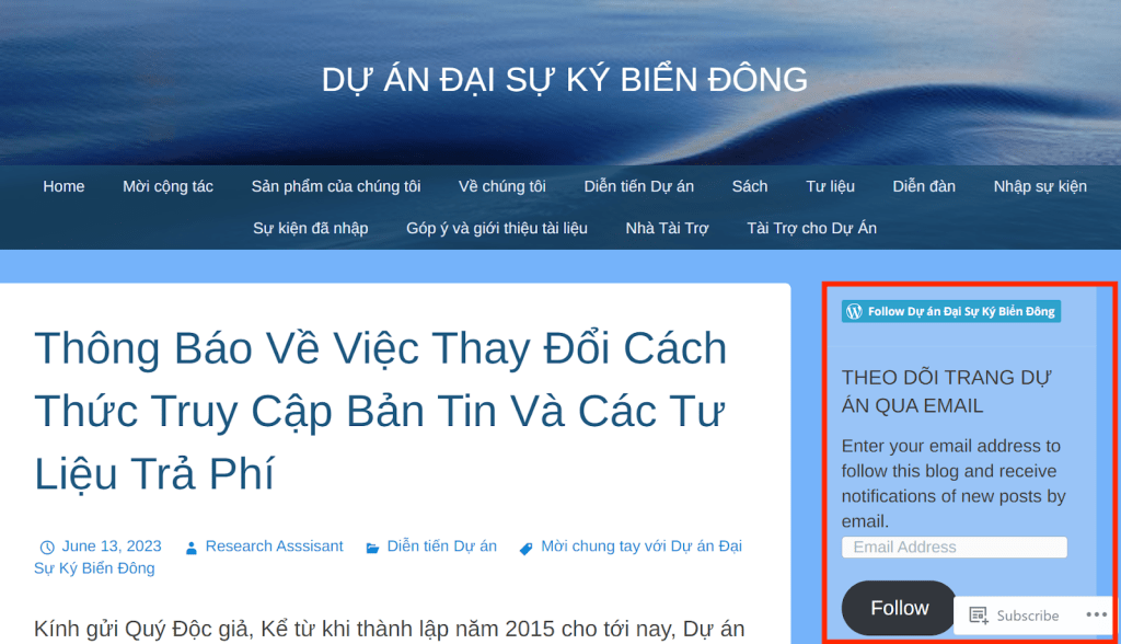 WordPress cung cấp công cụ theo dõi “Subscribe” (Đăng ký), cho phép quý độc giả nhận được bài mới đăng qua địa chỉ email của mình. Để đăng ký nhận bài mới, quý độc giả có thể lựa chọn công cụ này trên thanh công cụ nổi ở góc dưới bên phải của website Dự án và nhập địa chỉ email; hoặc nhập trực tiếp địa chỉ email vào thanh công cụ “Theo dõi Trang Dự án qua email” bên tay phải của website và chọn “Follow” (Theo dõi) để xác nhận. Sau khi xác nhận, quý độc giả sẽ nhận được bài mới đăng được gửi tự động và trực tiếp tới địa chỉ email của mình.