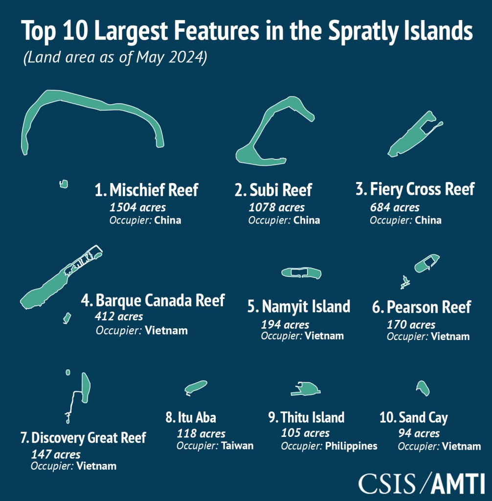 Những nỗ lực này đã đưa ba tiền đồn của Trung Quốc — Đá Vành Khăn, Đá Xu Bi và Đá Chữ Thập — từ chỗ nằm trong nhóm nhỏ nhất trở thành ba đảo lớn nhất — mặc dù là nhân tạo — ở Trường Sa. Trong điều kiện tự nhiên, Đá Vành Khăn và Đá Xu Bi chìm ở thuỷ triều cao, do đó theo luật biển quốc tế sẽ không đủ điều kiện được coi là lãnh thổ và không được hưởng lãnh hải riêng. Đá Chữ Thập nổi ở triều cao dưới dạng một số tảng đá nhỏ không có đất và cây cối. Bốn rạn san hô khác mà Trung Quốc chiếm đóng ở Quần đảo Trường Sa trong điều kiện tự nhiên cũng là đá như Đá Chữ Thập hoặc là các thực thể chìm ở triều cao giống như Đá Vành Khăn và Đá Xu Bi. Hiện nay, chúng cung cấp cho Trung Quốc 19 km2 đất trong mọi điều kiện thời tiết.