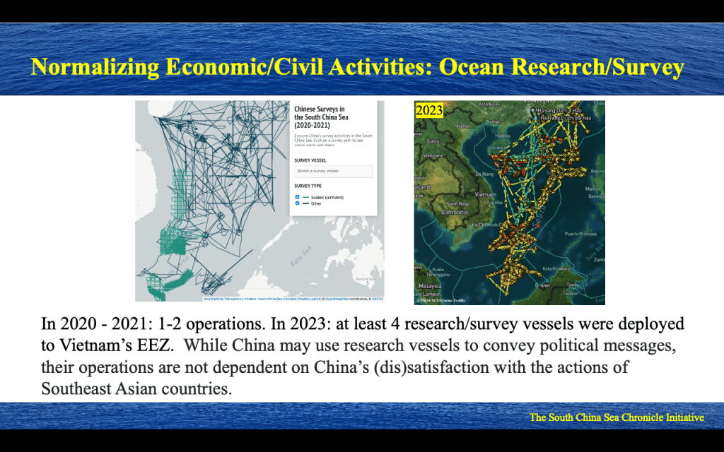 Kể từ năm 2019, Trung Quốc đã tăng cường tuần tra tại các khu vực mà Việt Nam khai thác dầu khí và triển khai tàu nghiên cứu trong vùng biển của Việt Nam với tần suất ngày càng tăng, đôi khi kéo dài trong nhiều tuần. Năm ngoái, sau khi gây sức ép một cách riêng tư buộc Trung Quốc rút tàu nghiên cứu nhưng không có kết quả, Việt Nam đã công khai khiển trách nước láng giềng. Vào tháng 6, Việt Nam một lần nữa lên tiếng về “hoạt động bất hợp pháp” của một tàu khảo sát Trung Quốc trong vùng đặc quyền kinh tế của mình.