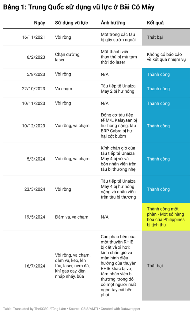 Từ những diễn biến này, AMTI đã kiểm tra lại nghiên cứu hồi tháng Giêng về các nhiệm vụ tiếp tế tới Bãi Cỏ Mây kể từ năm 2021 để xem xét việc tàu Trung Quốc sử dụng vũ lực nhằm ngăn cản các nỗ lực tiếp tế của Philippines.