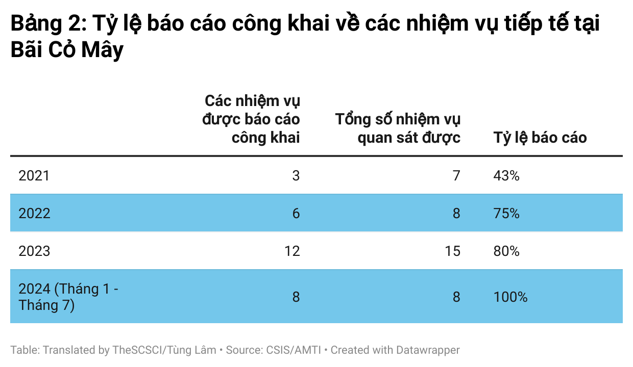 Bất chấp những lời chỉ trích gần đây về tính hiệu quả, sáng kiến minh bạch của Philippines vẫn được triển khai mạnh mẽ từ tháng Giêng đến tháng 7 năm 2024. Cả 8 nhiệm vụ tiếp tế được quan sát trên AIS cũng đều được Philippines báo cáo công khai, bao gồm cả nhiệm vụ tiếp tế đầu tiên sau khi Manila và Bắc Kinh đạt được thỏa thuận tạm thời hiện tại.