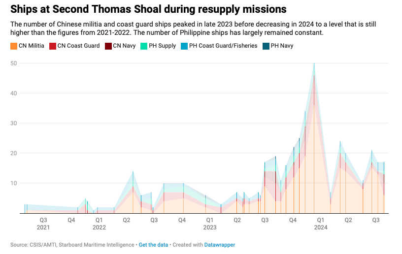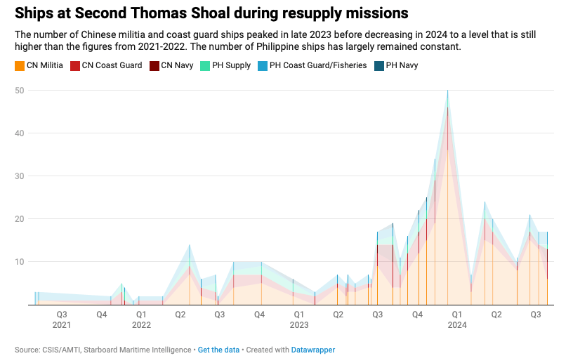 Bản cập nhật dữ liệu của AMTI về tàu Trung Quốc và Philippines được triển khai trong các nhiệm vụ tiếp tế cho thấy trong nửa đầu năm 2024, số lượng tàu Trung Quốc tham gia đã giảm so với mức đỉnh điểm vào cuối năm 2023.