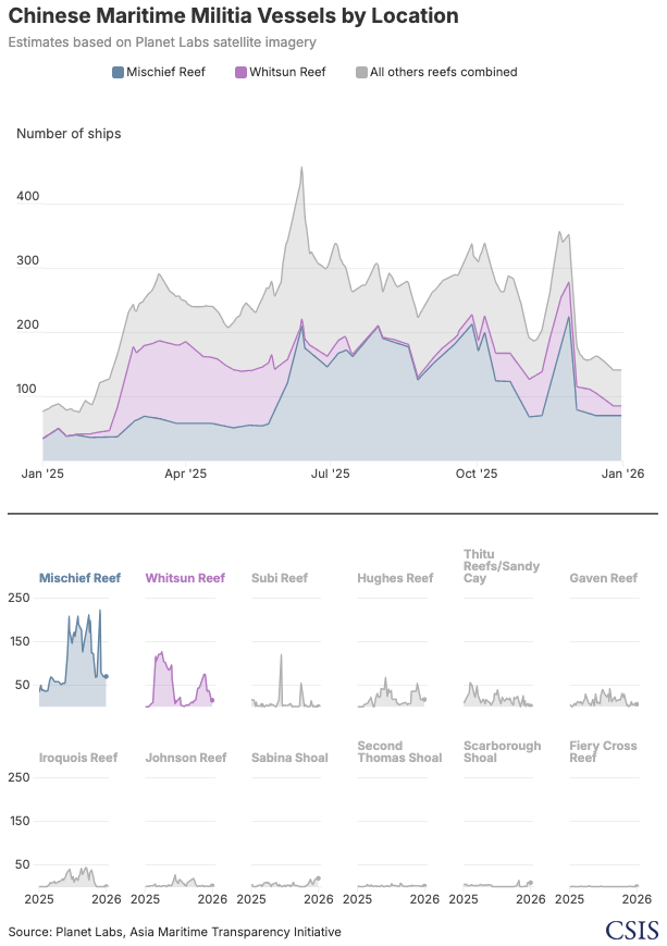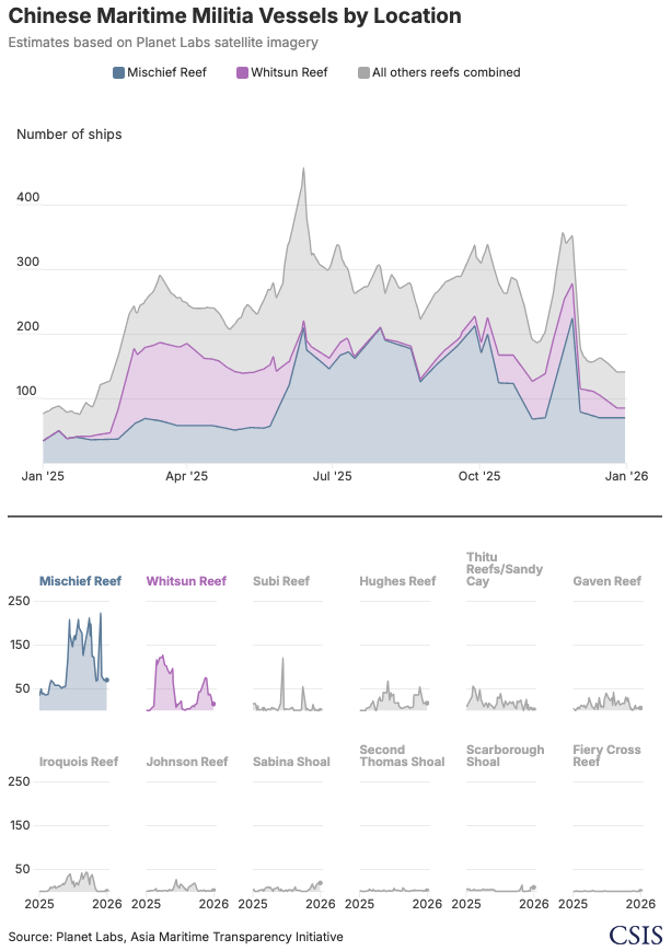 Mặc dù dân quân biển Trung Quốc là lực lượng tàu thuyền lớn nhất đang hoạt động trên Biển Đông, việc theo dõi hoạt động của lực lượng này gặp nhiều khó khăn do phần lớn các tàu khó nhận diện trên các nền tảng hệ thống nhận dạng tự động (AIS). Nhất quán với các năm trước, AMTI theo dõi hoạt động của dân quân biển thông qua hình ảnh vệ tinh thương mại tại các thực thể mà lực lượng này tập trung neo đậu trong suốt năm 2025. Bộ dữ liệu này đã được mở rộng lên 12 thực thể với sự bổ sung của thực thể Gạc Ma, nơi hình ảnh vệ tinh ghi nhận mức độ tập trung tàu thuyền vừa phải ở phía đông thực thể trong năm vừa qua.