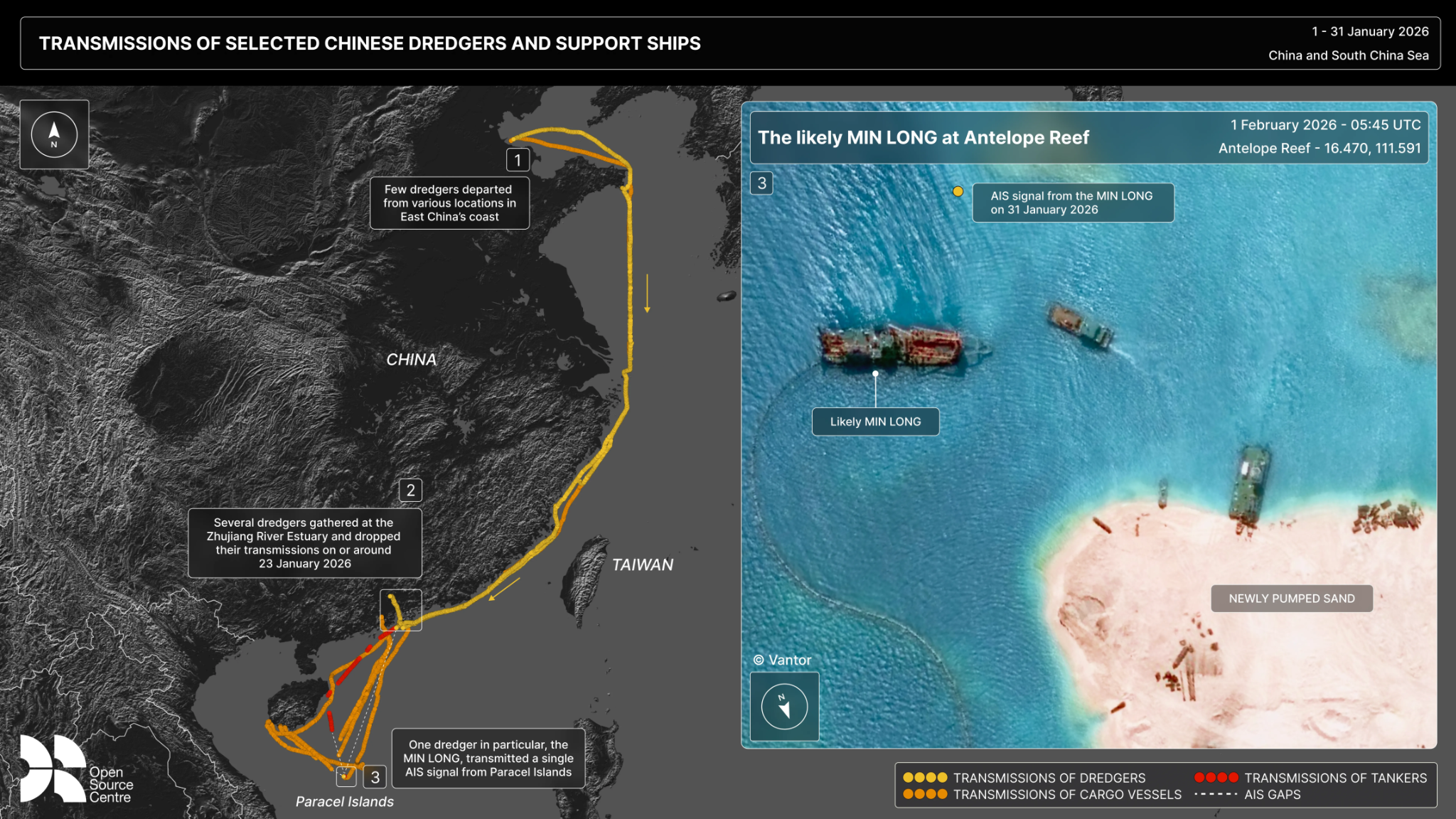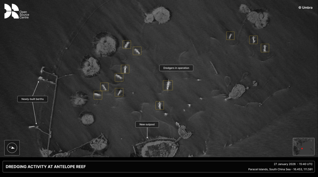 Đến đầu tháng 1 năm 2026, các tàu đã hoàn thành một kênh đi qua các bãi cạn hướng vào trung tâm rạn và mở rộng các bãi đổ trầm tích dọc mép ngoài. Trong quá trình di chuyển xuống phía nam để tập kết, nhiều tàu nạo vét đã tắt hệ thống nhận dạng tự động (AIS), khiến dữ liệu định vị công khai không phản ánh đúng số lượng thực tế trên hiện trường: có thời điểm vào cuối tháng 1, chỉ một tàu phát tín hiệu AIS trong khi ảnh vệ tinh cho thấy hàng chục tàu đang hiện diện quanh Bãi Hải Sâm, theo phân tích của Trung tâm Dữ liệu Nguồn mở.