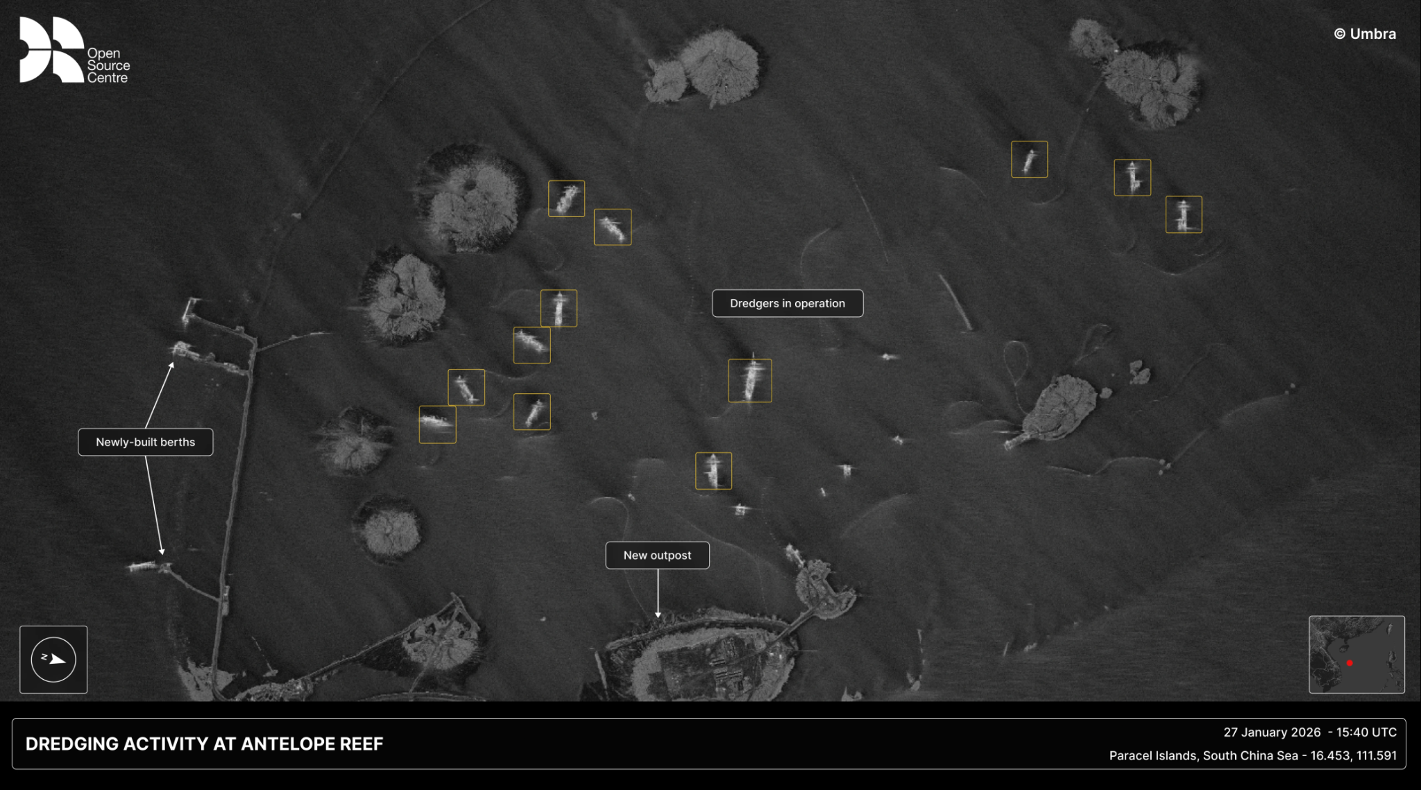 Đến đầu tháng 2 năm 2026, các ảnh vệ tinh thương mại và phân tích nguồn mở cho thấy chiến dịch đã được nâng cấp thành một hoạt động công nghiệp cường độ cao với hơn hai chục tàu hút bùn kiểu cắt – hút hoạt động đồng thời, nghiền nát đáy biển và bơm hỗn hợp đá – cát qua hệ thống đường ống nổi. Phần lớn số tàu này được ghi nhận trước đó tập kết tại khu vực cửa sông Châu Giang và xuất phát từ một số cảng miền bắc Trung Quốc. Các báo cáo nguồn mở đồng thuận rằng đa số tàu nạo vét mang cờ Trung Quốc và được vận hành bởi các công ty con thuộc một tập đoàn xây dựng hạ tầng lớn của nhà nước, từng bị Hoa Kỳ áp lệnh trừng phạt liên quan đến hoạt động bồi đắp ở Biển Đông [8]. Song song trên bề mặt, công nhân dựng nhà máy trộn bê tông, khu nhà ở tiền chế và một tuyến đường nội bộ chạy dọc khu vực cảng tương lai. Đến giữa tháng 2, cần cẩu, xe ben và máy san ủi hoạt động dày đặc, cho thấy giai đoạn định hình đảo nhân tạo đã bắt đầu.
