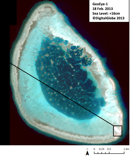 Tuy nhiên, 17,12 km² bề mặt rạn đó không phải đất tự nhiên. Cùng bức ảnh vệ tinh tháng 2 năm 2013, CIL-NUS đo được phần thực sự nhô trên mặt nước tại thời điểm chụp (khi mực nước biển ở mức +16 cm so với chuẩn) chỉ là 0,037 km² (3,7 ha), nằm ở đầu đông nam rạn, trong đó phần có công trình xây dựng chỉ rộng khoảng 100 m × 60 m. Đáng chú ý, CIL-NUS xác nhận rằng “phần cát ở rìa tây bắc và đông nam của khu vực nhô trên mặt nước thay đổi hình dạng và diện tích dưới tác động kết hợp của thủy triều thiên văn, nước dâng do bão và sóng gió” – tức là đây là thực thể động, không ổn định về mặt địa lý. Mặt rạn bên ngoài, theo CIL-NUS, có độ sâu 0,9-1,4 m tại Mực nước biển trung bình và chỉ lộ ra khi đạt tới Mực triều thiên văn thấp nhất (Lowest Astronomical Tide), trong khi tại Mực triều cao trung bình (Mean High Water Spring), mực nước dự kiến tăng thêm 61 cm so với thời điểm chụp ảnh, đủ để “phủ một phần hoặc hoàn toàn các bãi cát.”